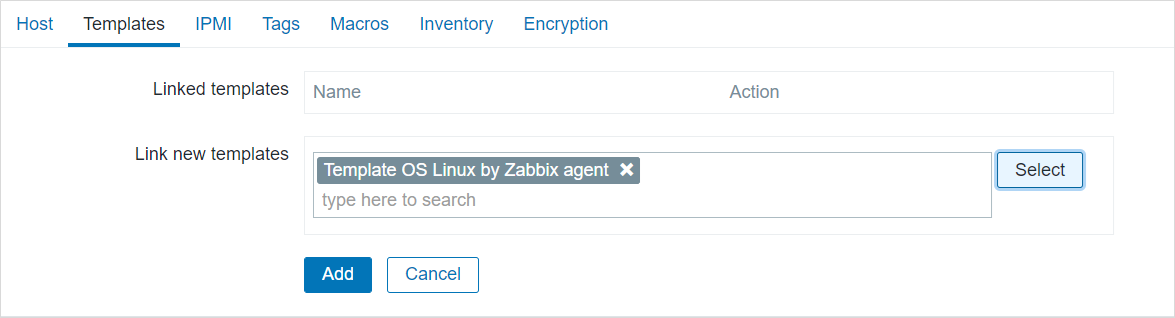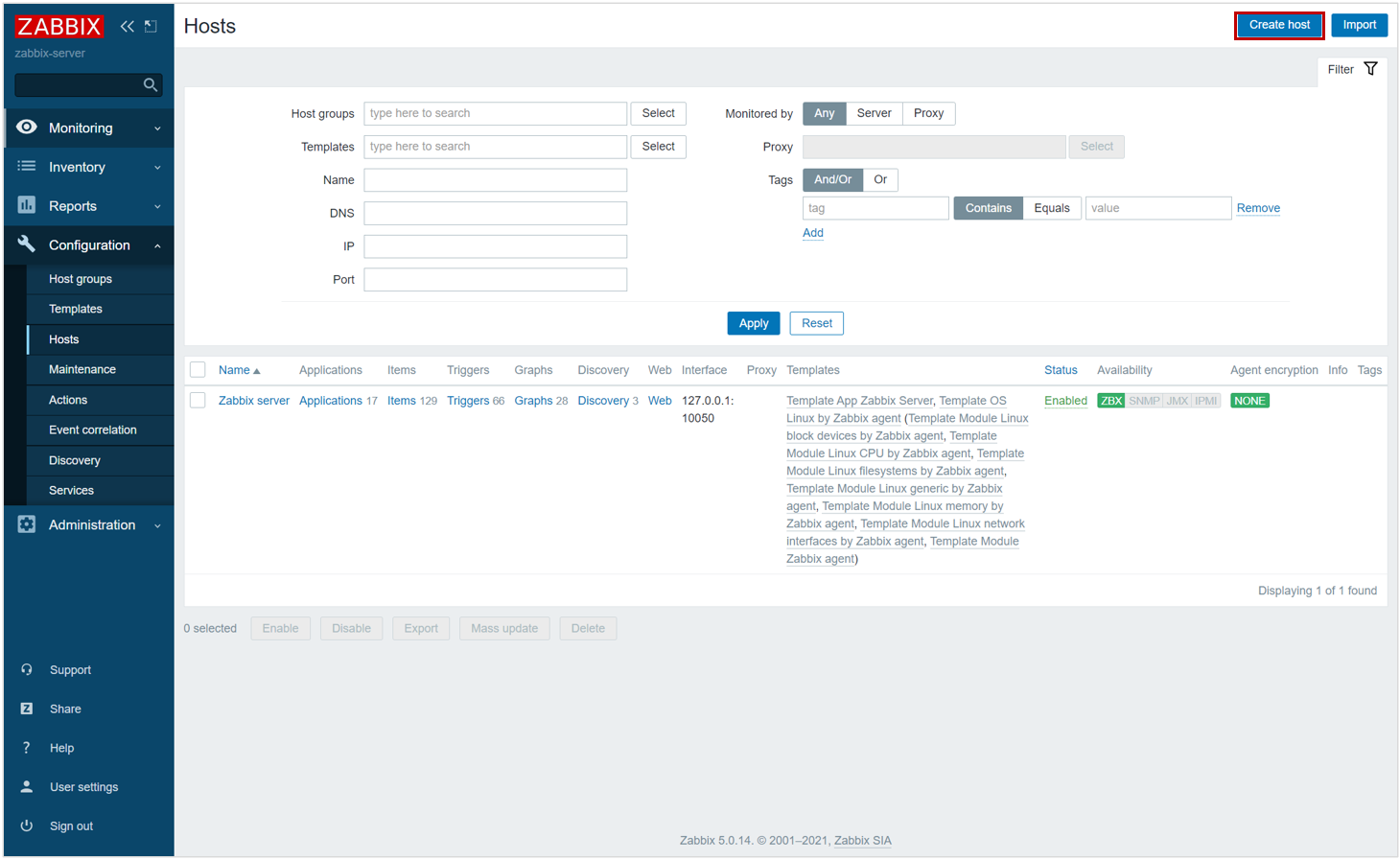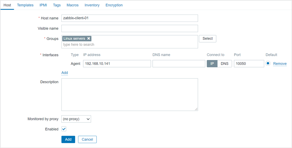 - Configuration > Hosts > Create host